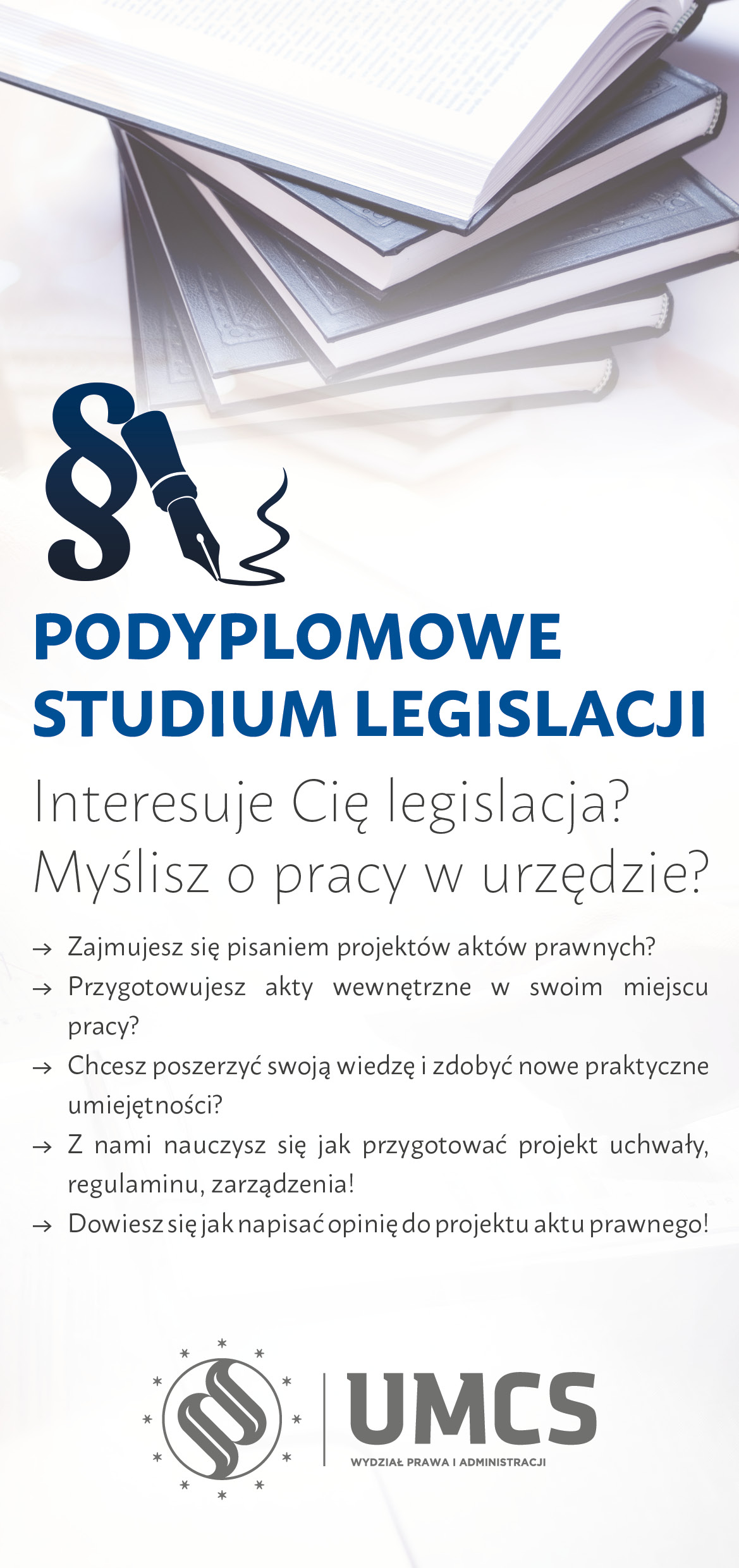jest mi niezwykle miło poinformować, że Wydział Prawa i Administracji UMCS już po raz szósty zaprasza na Podyplomowe Studium Legislacji. Dobre doświadczenia poprzednich edycji oraz sprawdzona formuła zajęć sprawia, że kierunek ten jest bardzo atrakcyjny.